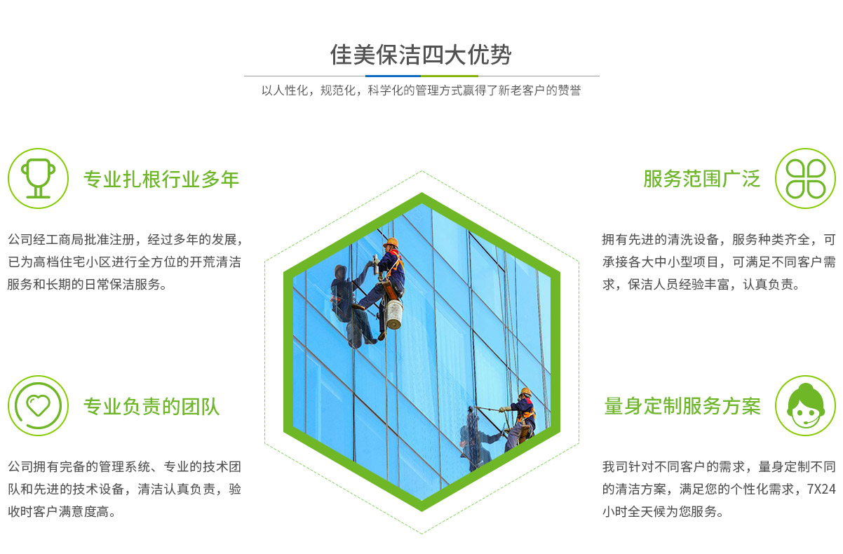 - 馬鞍山市佳美保潔服務(wù)有限公司是一家經(jīng)工商部門批準(zhǔn),具有法人資格專業(yè)清洗,馬鞍山保潔服務(wù)的公司,自創(chuàng)辦以來,一直致力于企業(yè),家庭,賓館,學(xué)校,別墅,酒店,商廈,公共設(shè)施等場所提供科學(xué)的日常保潔和清潔保護(hù)的服務(wù)公司,有著豐富的管理服務(wù)和保潔經(jīng)驗(yàn)...